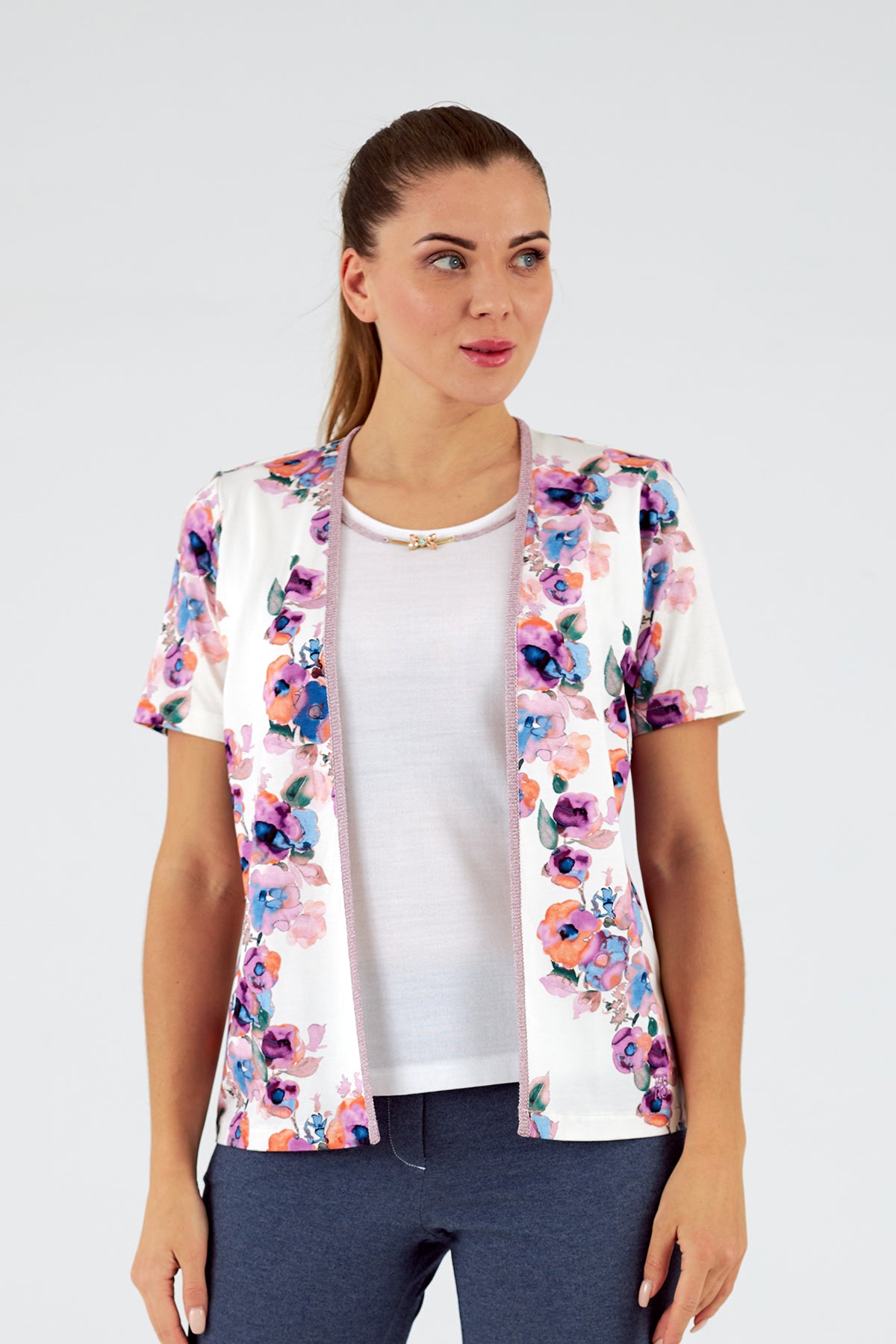 Jersey efecto dos piezas de manga corta con cuello redondo con adorno cristales de Swarovski confeccionado con un alto porcentaje en viscosa, fabricado en España de forma artesanal.