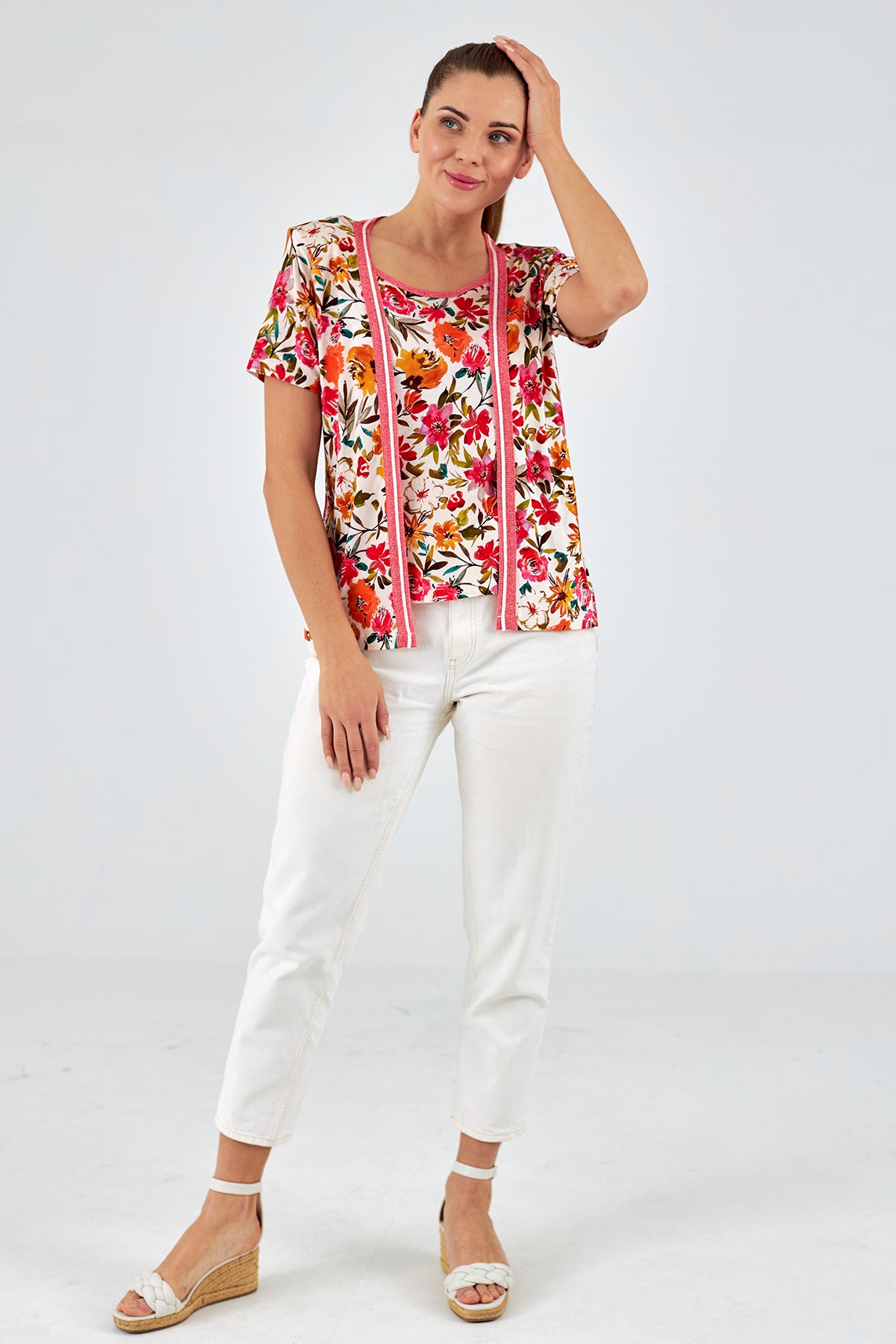 Jersey efecto dos piezas de manga corta con cuello redondo, confeccionado con un alto porcentaje en viscosa, fabricado en España de forma artesanal.
